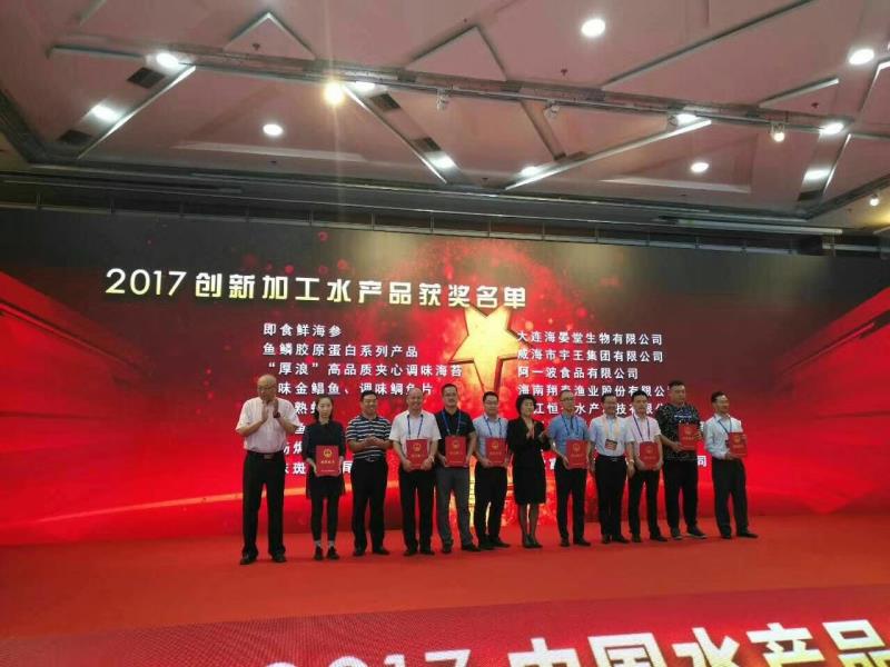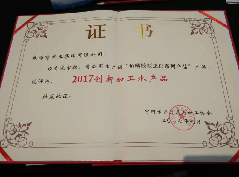 922日,“2017中國水產品品牌大會”在京召開,威海市宇王集團有限公司在本次大會上榮獲“2017最具影響力水產品企業品牌”大獎;經專家組審核,公司的魚鱗膠原蛋白系列產品榮獲“2017創新加工水產品”大獎。